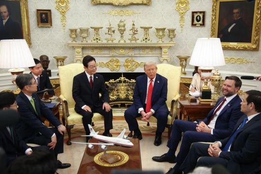 이재명 대통령이 25일(현지 시각) 미국 워싱턴 DC 백악관 오벌 오피스에서 도널드 트럼프 미국 대통령과 한미 정상회담을 하고 있다./연합뉴스