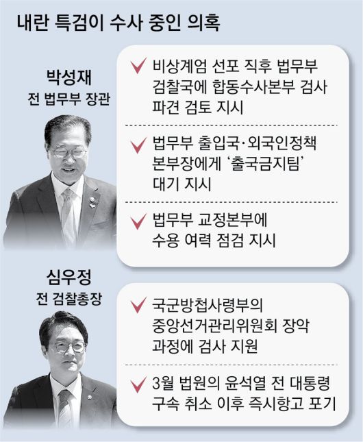 특검은 비상계엄 선포 직후 박 전 장관과 세 차례 통화한 심 전 총장의 휴대전화도 압수수색했다. 심 전 총장이 올 3월 법원의 윤 전 대통령에 대한 구속취소 결정 이후 즉시 항고를 포기한 경위에 대해 특검은 수사 중이다. 대검이 당시 법원에 불복 절차인 즉시항고를 하지 않으면서 수감돼 있던 윤 전 대통령은 풀려났다.