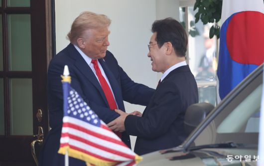 이재명 대통령과 도널드 트럼프 미국 대통령이 25일(현지 시간) 낮 12시 32분경 백악관에서 만나 웃는 얼굴로 인사를 하고 있다. 이 대통령이 차량에서 내리자 트럼프 대통령은 오른손으로 이 대통령과 악수를 하면서 왼손을 이 대통령의 오른쪽 팔에 갖다 대며 친근함을 표했다. 두 정상은 트럼프 대통령 집무실인 오벌오피스에서 양자회담을 하고, 이후 캐비닛룸으로 장소를 옮겨 오찬을 겸한 회담을 이어갔다. 워싱턴=송은석 기자 silverstone@donga.com |
