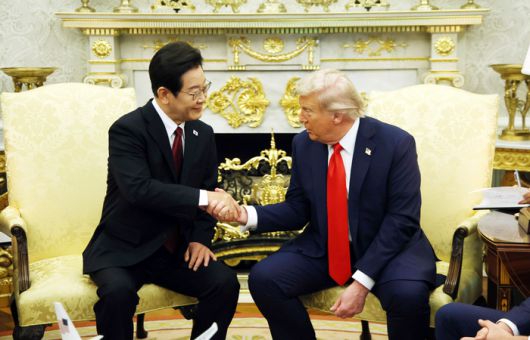 이재명 대통령과 도널드 트럼프 미국 대통령이 25일(현지시간) 미국 워싱턴DC 백악관 오벌 오피스에서 만나 정상회담에 앞서 악수하고 있다. 워싱턴 김호영 기자 |