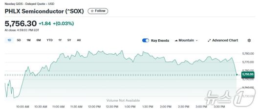25일(현지 시각) 뉴욕증시에서 반도체지수는 0.03% 상승한 5756.30포인트를 기록했다.
