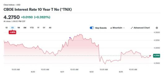미 국채 10년물 금리 차트, 자료=야후 파이낸스, 2025.08.26 koinwon@newspim.com |