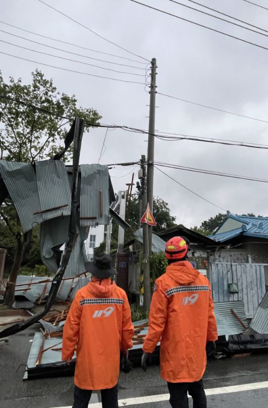 26일 호우 특보가 내려진 전북 전주시 덕진구 한 주택에 지붕이 날아가 소방관이 확인하는 모습/전북특별자치도 소방본부 |