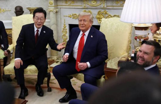 이재명 대통령과 도널드 트럼프 미국 대통령이 25일(현지시간) 미국 워싱턴DC 백악관에서 정상회담을 하고 있다. 맨 오른쪽은 밴스 부통령. 연합뉴스