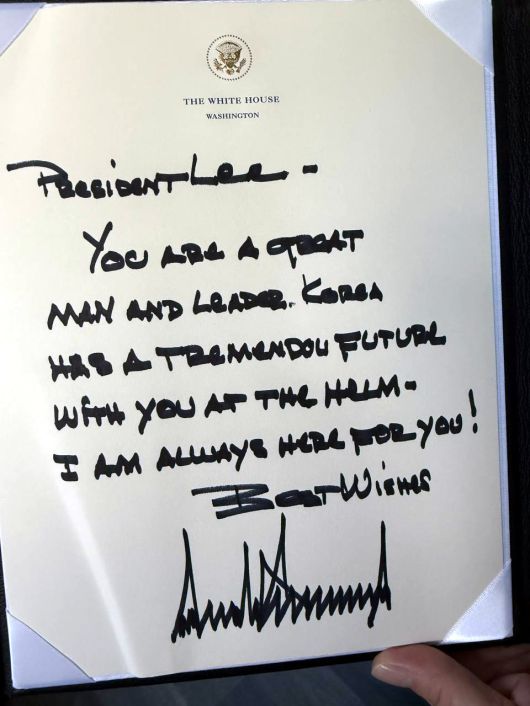 도널드 트럼프 미국 대통령이 이재명 대통령에게 “한국은 당신과 함께 더 높은 곳에서 놀라운 미래를 갖게 될 것이다. 난 언제나 당신과 함께 있다”라는 자필 메시지 사진. 강유정 대변인 제공 |