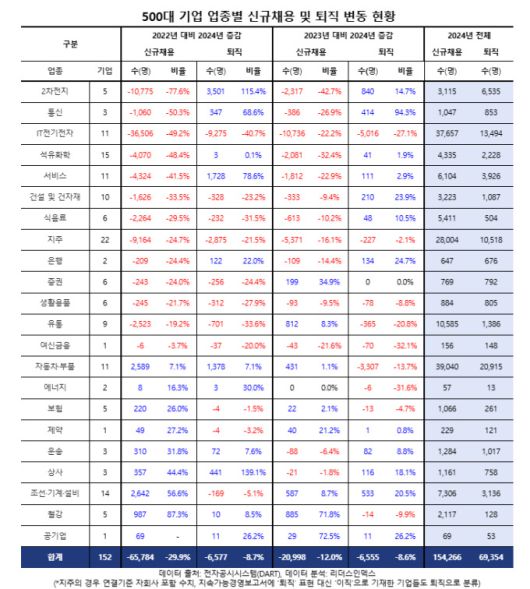 26일 리더스인덱스가 500대 기업 가운데 올해 지속가능경영보고서를 제출한 152개사 중 신규 채용 및 퇴직 인원을 공개한 기업의 고용 현황을 분석한 결과, 2024년 기준 전체 신규 채용 인원은 15만4266명으로 전년보다 12.0%(2만998명) 줄었다. 2년 전과 비교하면 무려 29.9%(6만5784명) 감소한 수치다. 같은해 퇴직자는 6만9354명으로 전년 대비 12.0%, 2년 전과 비교하면 8.7% 줄었다.