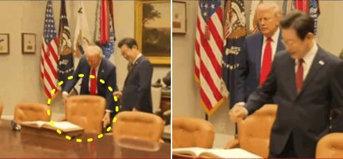 도널드 트럼프 미국 대통령이 25일 첫 한미 정상회담 기념 서명식에서 이재명 대통령의 의자를 직접 빼주는 모습이 포착됐다.