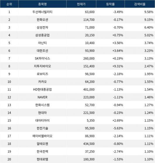 이어 한화오션(042660)이 검색비율 2위를 기록하며 0.17%의 하락세를 기록하고 있다. 검색비율 3위의 삼성전자(005930)는 0.70% 하락하며 출발했다. 검색비율 4위 삼성중공업(010140)은 개장 초반부터 0.75%의 상승률을 보이고 있다. 검색비율 5위 아난티(025980)는 3.56% 상승하며 강세를 보이고 있다.
