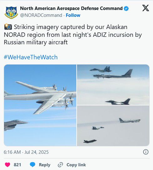 북미항공우주방위사령부(NORAD)에 따르면 러시아의 정찰기 IL-20 한 대가 알래스카 ADIZ에서 탐지된 후 전투기를 출격시켜 감시했다.
