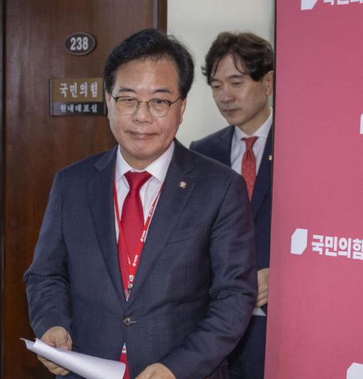 국민의힘 송언석 비상대책위원장 겸 원내대표가 26일 국회에서 한미 정상회담 관련 브리핑을 하기위해 발언대로 향하고 있다. 연합뉴스 |