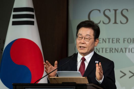 25일 미국 워싱턴에 위치한 전략국제문제연구소(CSIS)에서 이재명 대통령이 외교 정책에 대해 연설하고 있다. 워싱턴DC AP 연합뉴스 |