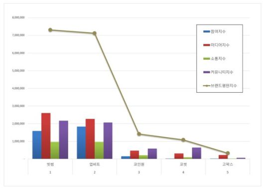 2위, 업비트 브랜드는 참여지수 1,833,700 미디어지수 2,262,373 소통지수 960,030 커뮤니티지수 2,071,237이 되면서 브랜드평판지수 7,127,341로 분석됐다. 지난 7월 브랜드평판지수 5,851,202와 비교해보면 21.81% 상승했다.