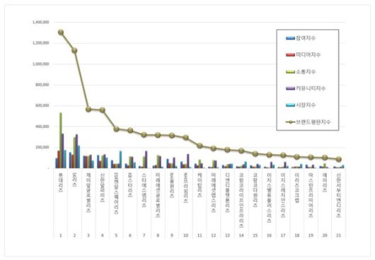2위, SK리츠 브랜드는 참여지수 153,448 미디어지수 130,839 소통지수 298,868 커뮤니티지수 326,521 시장지수 219,715가 되면서 브랜드평판지수 1,129,392로 분석됐다. 지난 7월 브랜드평판지수 1,413,516과 비교해보면 20.10% 하락했다.