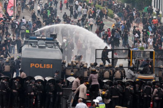 25일(현지시간) 인도네시아 자카르타 국회의사당 밖 집회에서 경찰이 물대포를 동원해 시위대 해산을 시도하고 있다/EPA 연합뉴스 |