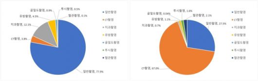 의료방사선 검사 종류별 건수 비율(왼쪽), 감사 종류별 피폭선량 비율(오른쪽) 질병관리청 |