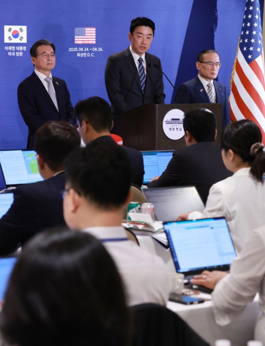 강훈식 비서실장은 “트럼프 시대의 통상 협상, 안보 협상의 뉴노멀은 계속 끊임없이 논의하는 것”이라며 “과거와 같이 뭔가 하나가 끝난다고 해서 끝나는 것이 아니라 계속된 협상의 과정과 과정에 있다고 봐야 한다”고 설명했다.