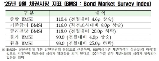 BMSI는 채권시장 참여자들의 설문을 통해 산출되는 지수로 100 이상이면 채권시장 심리가 양호하여 채권가격 상승(금리 하락)할 것을, 100 이하면 채권시장 심리 위축돼 있음을 의미한다.