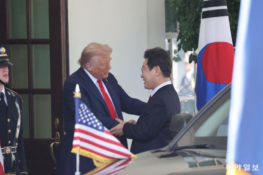 도널드 트럼프 미국 대통령이 25일(현지시간) 워싱턴DC 백악관에서 이재명 대통령을 맞이하고 있다. 워싱턴=송은석 기자 silverstone@donga.com |