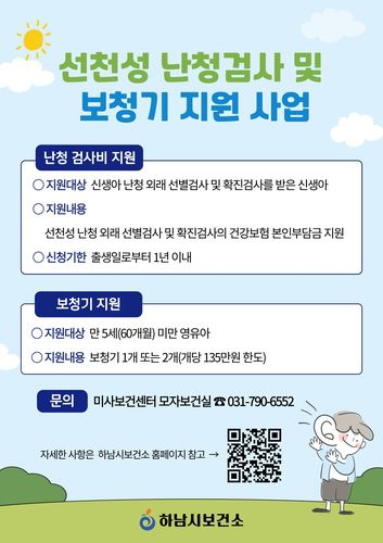 하남시는 이에 발맞춰 ▲건강보험이 적용된 신생아 난청 외래 선별검사비의 본인부담금(최대 2회) ▲재검 판정을 받은 아동의 확진검사비 본인부담금(최대 7만 원)을 지원한다. 신청은 출생일로부터 1년 이내 가능하다.