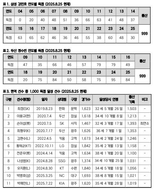 25일 경기까지 마친 시점에서 현역 선수 중 1000득점을 기록한 선수는 총 11명이다. 강민호와 정수빈 중 먼저 득점을 기록하는 선수가 KBO 리그 역대 26번째이자 현역 선수 중 12번째 1000 득점 달성 주인공이 된다.