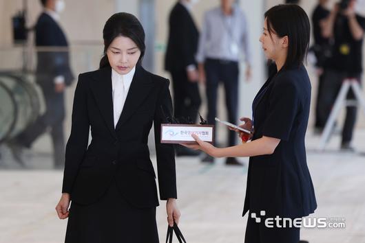 김건희 여사가 6일 서울 종로구 KT 광화문빌딩 웨스트에 마련된 민중기 특별검사 사무실로 출석하고 있다. 사진공동취재단 |