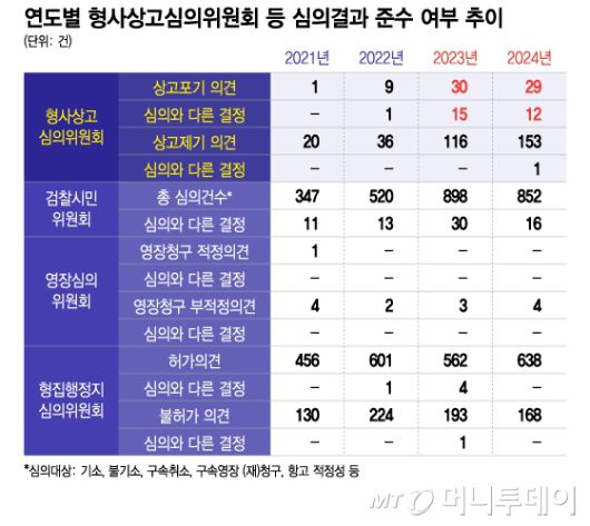 그러나 최근 2년 사이 심의위 의견을 따르지 않은 사례가 급증했다. 2023년 심의위가 상고 포기 의견을 낸 30건 중 담당 검사가 심의 결과와 다른 결정을 내린 경우는 15건에 달했다. 지난해에는 상고 포기 의견이 29건이었고 상고가 제기된 경우가 12건으로 집계됐다. 반면 2023년과 지난해 심의위가 상고를 해야 한다는 의견을 낸 269건 중 상고하지 않은 검사의 결정은 지난해 단 1건뿐이었다.