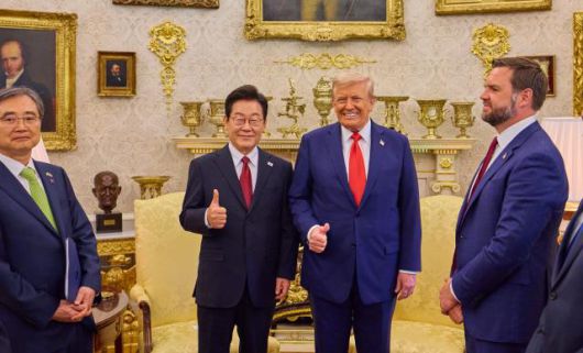 이재명 대통령이 25일(현지시간) 미국 워싱턴DC 백악관에서 열린 한미 정상회담에서 도널드 트럼프 미국 대통령과 엄지손가락을 들어보이며 미소짓고 있다.[사진=연합뉴스] |