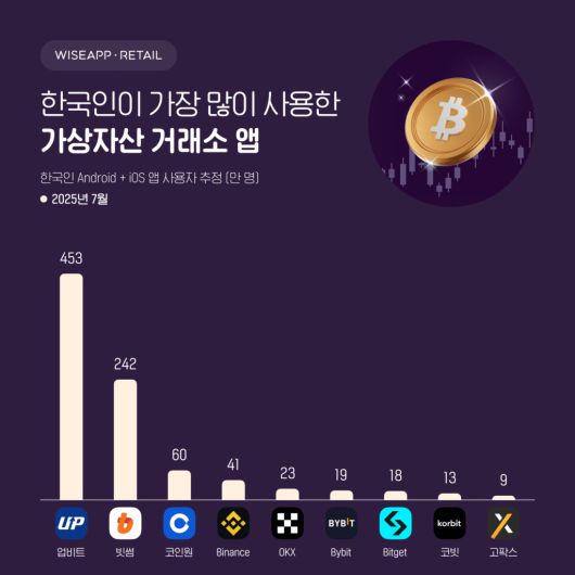 조사 결과 월간 활성 사용자 수(MAU) 기준으로 업비트가 453만 명으로 1위를 차지했다. 빗썸이 242만 명으로 2위, 코인원이 60만 명으로 3위를 기록했다. 이어 바이낸스 41만 명, OKX 23만 명, 바이비트 19만 명, 비트겟 18만 명, 코빗 13만 명, 고팍스 9만 명 순으로 집계됐다.