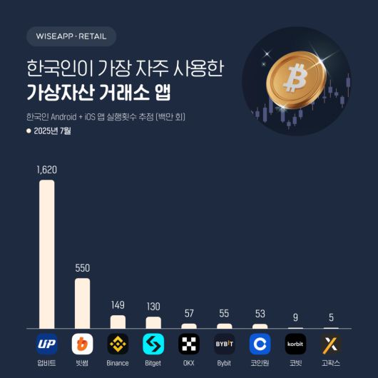 앱 실행 횟수에서도 업비트가 16억 2천만 회로 1위를 기록했다. 빗썸은 5억 5천만 회로 2위, 바이낸스가 1억 4천9백만 회로 3위를 차지했다. 비트겟 1억 3천만 회, OKX 5천7백만 회, 바이비트 5천5백만 회, 코인원 5천3백만 회, 코빗 9백만 회, 고팍스 5백만 회 순으로 나타났다.