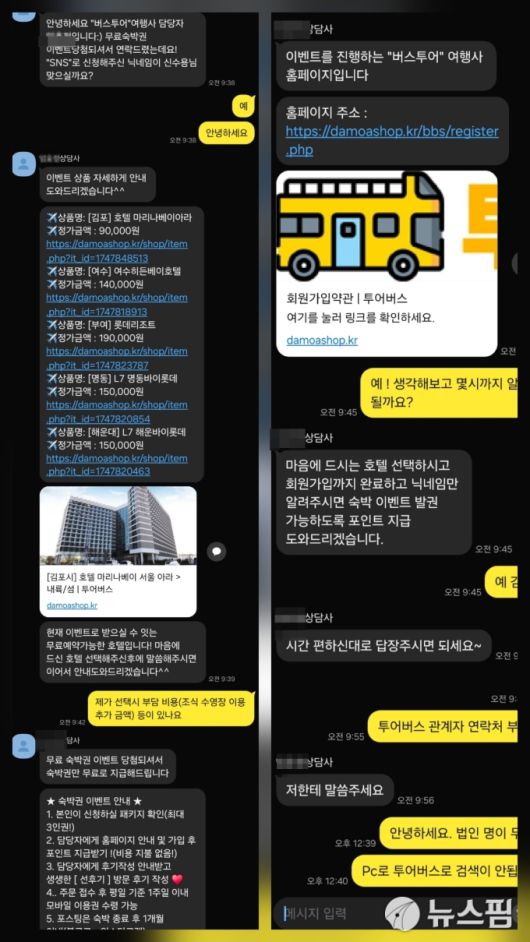 [서울=뉴스핌] 신수용 기자 = "무료 숙박권에 당첨되었습니다." 22일 아침 9시 38분경 여행사 담당자 이연주(가명) 씨가 카카오톡 메시지를 본보 기자에게 보냈다. 지난밤 인스타그램을 통해 응모한 이벤트였다. 그가 선택지로 제시한 호텔들은 주로 5성급이었다. 본보 기자는 무심코 이 씨가 보낸 여행사 홈페이지 링크(URL)를 클릭했다. 비극이 시작됐다.