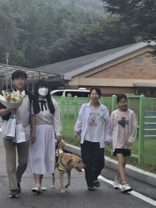 [서울=뉴시스] 삼성화재 안내견 태극이와 태극이의 파트너(왼쪽), 태극이를 1년동안 돌봐준 자원봉사자 퍼피워커 가족(오른쪽)이 함께 걷고 있다. (사진=권안나 기자) 2025.08.26. mymmnr@newsis.com *재판매 및 DB 금지 |