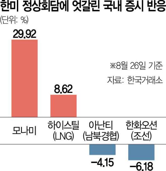 도널드 트럼프 미국 대통령이 이재명 대통령이 사용한 만년필에 관심을 보이자 모나미(005360) 주가가 상한가를 기록했다. 알래스카 액화천연가스(LNG) 개발 프로젝트 참여를 거듭 요청하면서 강관 관련 종목들이 강세를 보였고, 조선 업종과 남북 경협주는 차익 매물 출회로 약세를 면치 못했다.