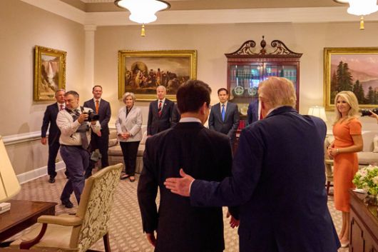 이재명 대통령이 25일(현지시간) 미국 워싱턴DC 백악관에서 열린 한미 정상회담에 앞서 도널드 트럼프 미국 대통령과 함께 미국 측 수행원들을 소개받기 위해 이동하고 있다. 김현동 기자 |