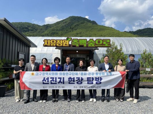 대구시의회 의원연구단체 ‘문화·관광 활성화 포럼(대표 권기훈 의원)’가 지난 25일 생태관광 우수사례로 꼽히는 충북 제천시 측백나무숲과 체험관 ‘측백숲으로’를 방문해 현장 답사를 하고 있다.사진=대구시의회(포인트경제) |