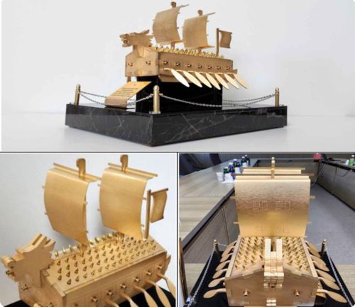 26일 업계에 따르면 거북선 모형에 들어간 문양은 이를 제작한 오정철 HD현대중공업 명장(기계조립 직종)의 대한민국 명장마크와 후면에 각인된 본인의 직인뿐이다. 선물 받는 사람과 선물을 제작한 사람 이외에는 주는 쪽(한국 대통령실)에 대한 내용은 흔적도 없다. 오 명장은 “모형의 금속 패널에 ‘트럼프 대통령을 위한 선물’이라는 간소한 문구 이외에는 어떤 그림도 새기지 말라는 정부(외교부)로부터 요청을 받아 제작에 들어갔다”면서 ““트럼프 대통령에게 주는 선물이라는 생각에 최선의 노력을 다 했고 공정별로 세세한 부분까지 직접 챙겼다”고 말했다.