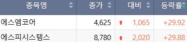 같은 날 코스닥 시장에서는 에스엠코어와 에스피시스템스가 상한가를 기록했다. 하한가를 기록한 종목은 없었다.