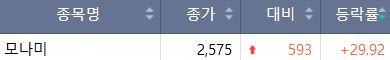 이날 모나미는 전일 대비 29.92% 오른 2575원에 마감했다.