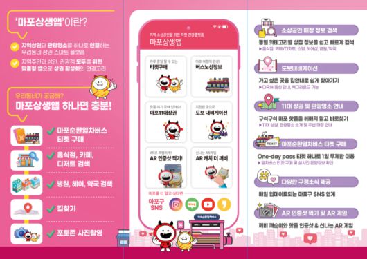 ‘지역 소상공인을 위한 착한 관광 플랫폼’이라는 슬로건 아래 개발된 이번 앱은 △관광·문화 콘텐츠 △상권·매장 정보 △마포순환열차버스 운행 △생활·구정 소식 등을 중심으로 다양한 편의 기능을 선보인다.