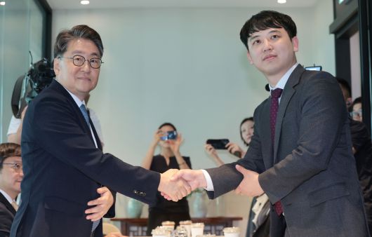 26일 서울역사 내 한 한식집에서 열린 대한전공의협의회-대한수련병원협의회 간담회에서 김원섭 대한수련병원협의회 회장(왼쪽)과 한성존 대한전공의협의회 비상대책위원장이 악수를 하고 있다. <연합뉴스> |