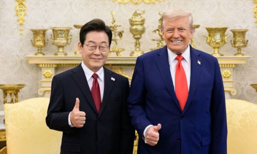 이재명 대통령과 도널드 트럼프 미국 대통령이 26일(한국시각) 새벽 미국 워싱턴 백악관 오벌 오피스에서 열린 첫 한-미 정상회담에서 엄지손가락을 들어 보이며 기념사진을 찍고 있다. 백악관 엑스(X) 계정 갈무리 |