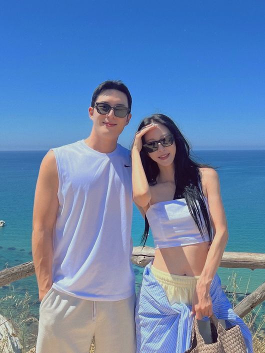 공개된 사진에는 푸른 바다를 배경으로 여행을 즐기고 있는 두 사람의 모습이 담겼으며, 선남선녀 비주얼의 다정한 투샷이 눈길을 끈다.