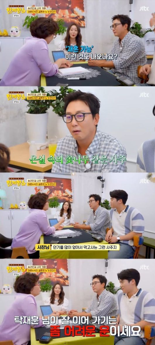 탁재훈의 관상을 본 역술인은 "눈이 약간 짝눈이다. 이런 분들은 속에 있는 걸 조금 소극적으로 표현한다. 또 한 배우자로 이어가기 좀 어려울 수 있다"고 설명했다.