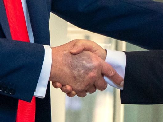 도널드 트럼프 미국 대통령의 손등에 멍이 든 것으로 추정되는 검푸른 자국이 있다. 〈사진=AP 연합뉴스〉 |