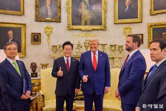 이재명 대통령이 25일(현지시간) 미국 워싱턴DC 백악관에서 도널드 트럼프 미국 대통령과 한미정상회담을 마치고 기념촬영하고 있다. 워싱턴=송은석 기자 silverstone@donga.com |