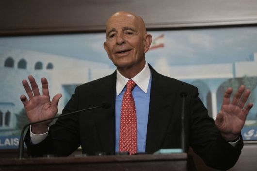 [베이루트=AP/뉴시스] 도널드 트럼프 미국 대통령의 시리아 특사로 활동 중인 톰 배럭 주튀르키예 미국대사는 레바논 정부가 오는 31일(현지 시간)까지 무장정파 헤즈볼라에 대한 구체적인 무장 해제 계획을 제출할 것이라고 밝혔다. 배럭 특사가 26일 베이루트 대통령궁에서 기자회견 중인 모습. 2025.08.26 |