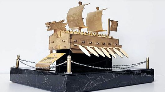 대통령실은 26일 이재명 대통령이 도널드 트럼프 미국 대통령에게 명장이 만든 ‘사즉생 생즉사’가 적힌 금속 거북선을 선물했다고 공개했다. [사진 대통령실] |