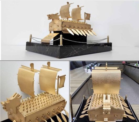 거북선은 실제 조선업 종사자가 제작한 거북선으로 전통과 현대를 아우르는 국내 조선 기술의 우수성을 알리고자 제작됐다는 설명이다. 이 거북선은 오정철 HD현대중공업 명장이 제작했다. 지난 7월 관세협상과 이번 정상회담을 통해 한미 양국은 조선업에서 협력해 나가기로 했다.