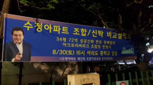 여의도 수정아파트 재건축 조합직접설립 준비위원회는 오는 30일 주민 설명회를 열고, '스타 조합장'으로 불리는 한형기 씨를 초빙해 조합 방식의 장단점을 공유할 예정이다. /사진=독자제공 |