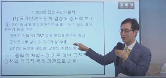 국민의힘이 국가인권위원회 상임위원으로 추천한 이상현 숭실대 법과대학 국제법무학과 교수가 2020년 10월16일 ‘차별금지법 바로 알기 아카데미’에서 강연을 하고 있다. 유튜브 갈무리 |