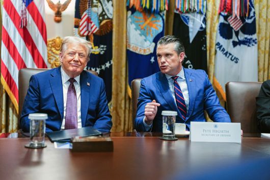 도널드 트럼프 미국 대통령이 26일(현지시간) 백악관에서 열린 국무회의에서 피트 헤그세스 국방장관의 이야기에 귀기울이고 있다. [EPA] |